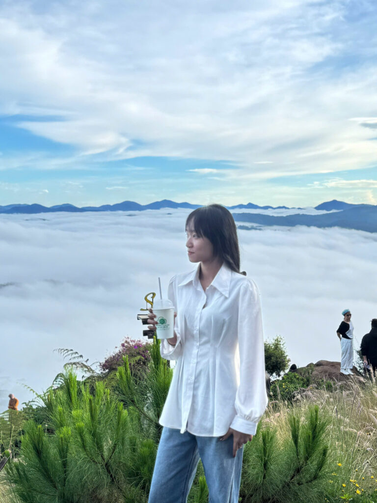 Chúng tôi khởi hành từ rất sớm để bắt trọn khoảnh khắc săn mây tại đồi chè Cầu Đất – một trong những địa điểm nổi tiếng nhất Đà Lạt. Không khí trong lành, sương mù mờ ảo quyện cùng sắc xanh bạt ngàn của đồi chè tạo nên khung cảnh tuyệt đẹp như tranh vẽ. Ai nấy đều tranh thủ check-in và lưu lại những tấm hình thật chill.