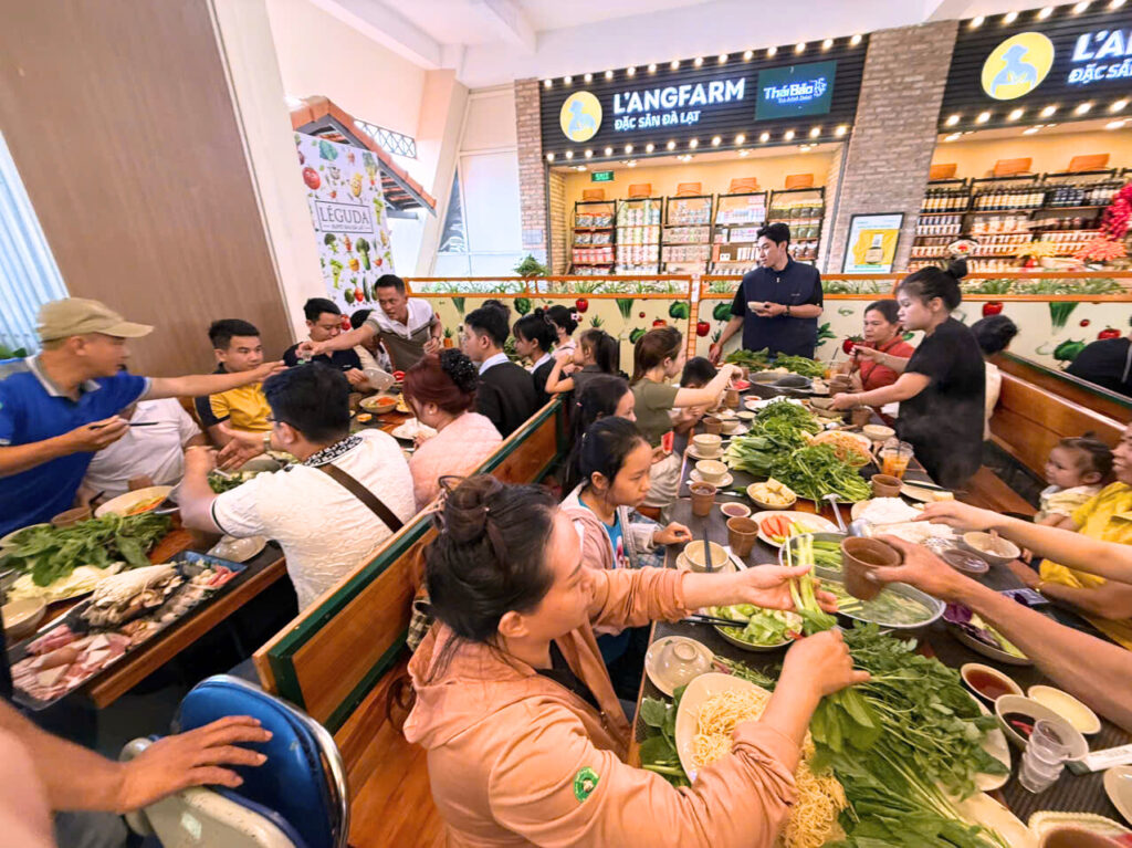 Sau hoạt động vui chơi, cả đoàn ghé buffet rau trên đèo Prenn – nơi nổi tiếng với các loại rau sạch, tươi ngon ăn cùng lẩu thanh đạm. Sau bữa trưa, đoàn tiếp tục tham quan Thiền viện Trúc Lâm – không gian yên bình, thanh tịnh giữa núi rừng. Đây là điểm dừng chân mang tính tâm linh mà sếp rất tâm đắc.